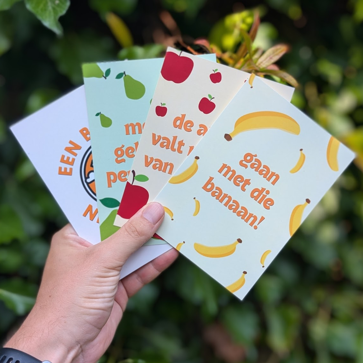 Bij iedere set krijg je ook een postkaart met het logo van de podcast.